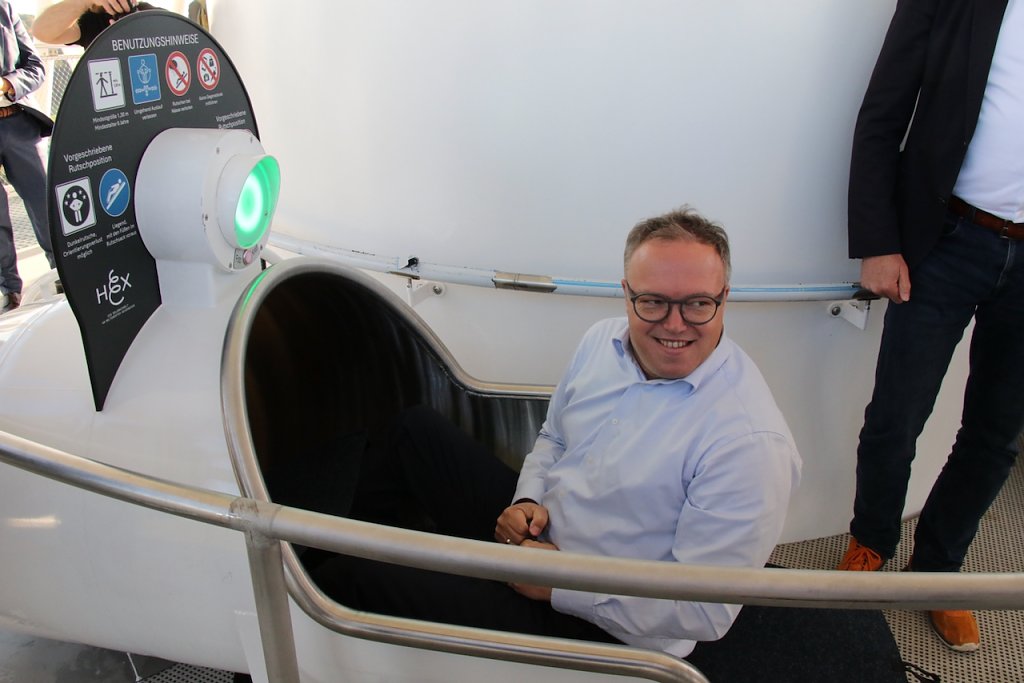 Mit der Matte unterm Arm geht es hinauf, viele Treppenstufen hat man zu erklimmen, ehe man auf 44 Metern Höhe einen Rundumblick über den Harz genießen kann. Aber nicht wegen der Landschaft im Herbstsonnenschein kam man heute ins schwitzen, zumindest nicht ausschließlich. Das zweite Highlight des Hexenbesens ist die große Rutsche: mit dem Arschleder unter dem Allerwertesten ging es in wilder Fahrt wieder hinab - daher das Geschrei und Gelächter, das bei rund 300 Gästen zur Eröffnung reichlich vom Turm herab schallte. Es wird mal dunkel, mal hell, mal neon - nach guten 20 Sekunden gleitet man dem Ende der Rutschpartie entgegen und kann sich sogleich wieder hinauf begeben - gerne auch mit dem Fahrstuhl.