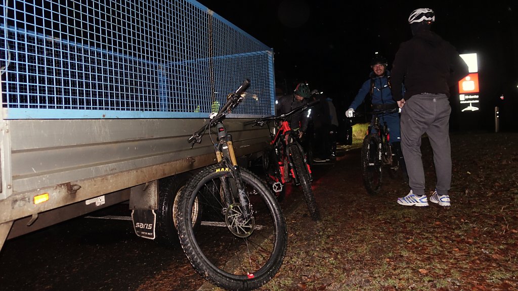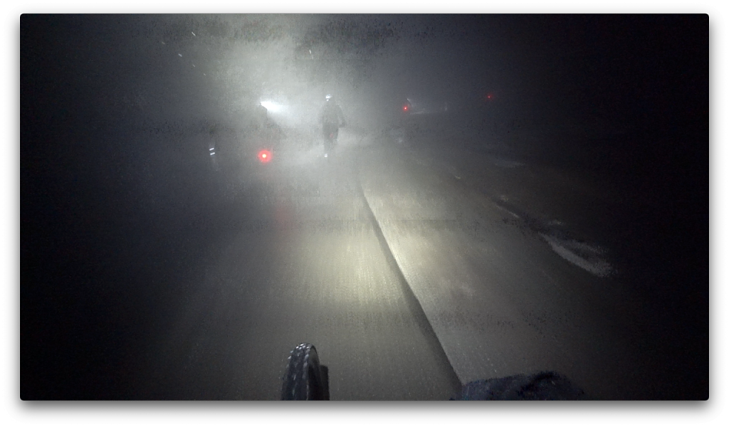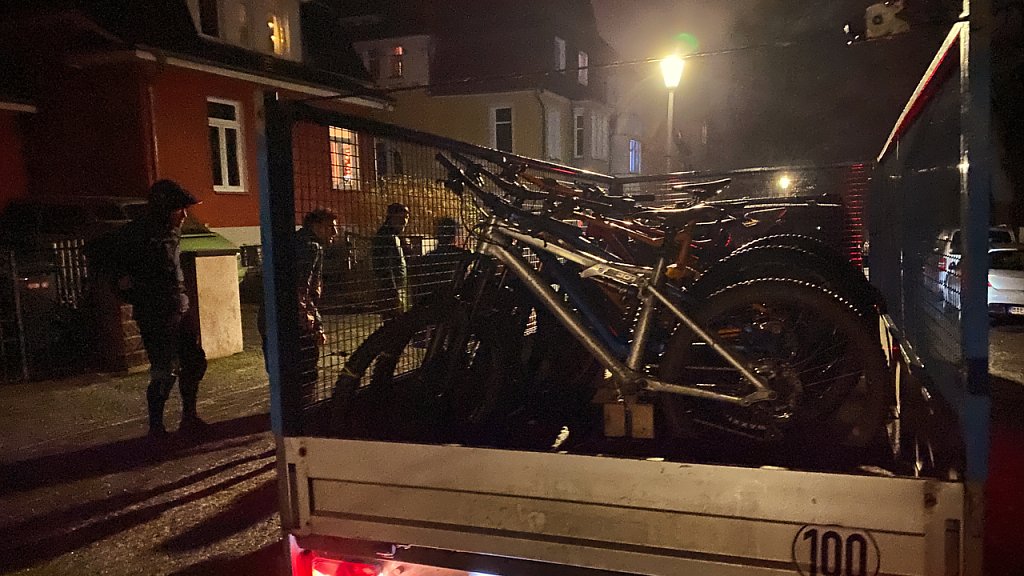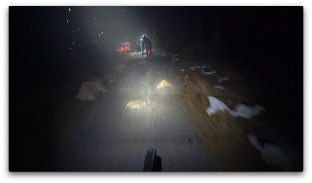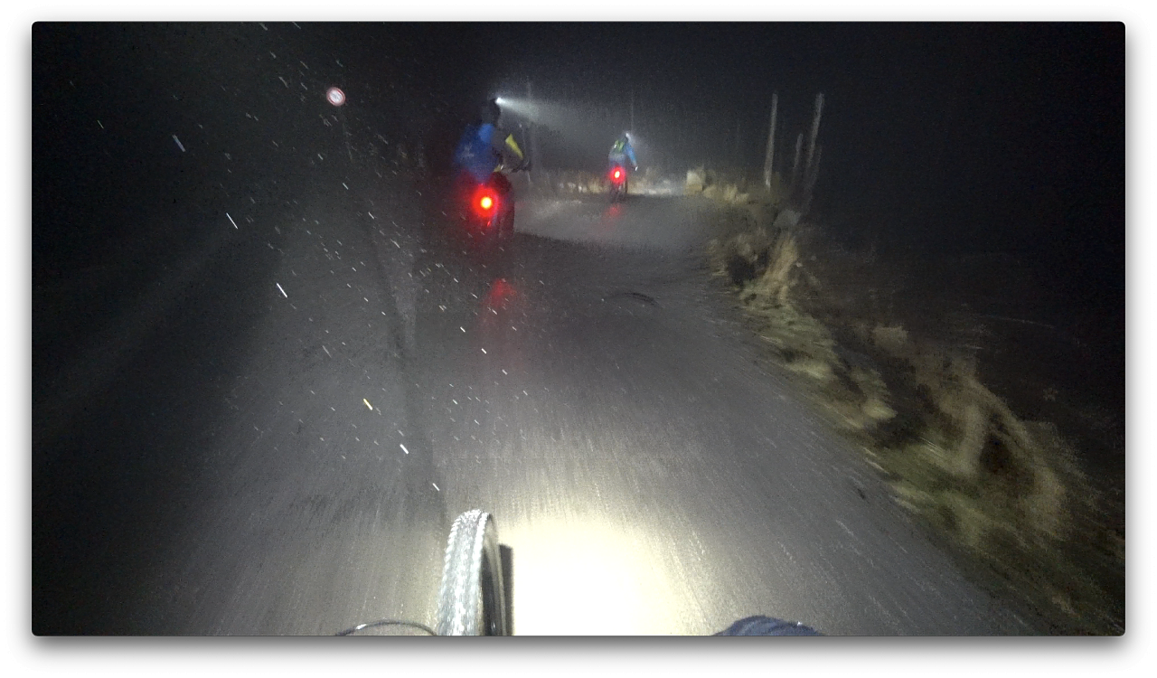 Oben stürmte es heftig und wir konnten uns kaum auf den Rädern halten. Zusammen mit dem leichten Regen, den eisigen Temperaturen und der Dunkelheit war es eine neue Erfahrung auf dem Bike. Ich weiß, wovon ich rede. Nach 18 Alpenüberquerungen habe ich schon einiges mit meinem Fahrrad er- und überlebt. Keine Ahnung, ob der Wind wirklich mit den vorhergesagten 103 Stundenkilometern blies, gefühlt, würde ich sagen ja.