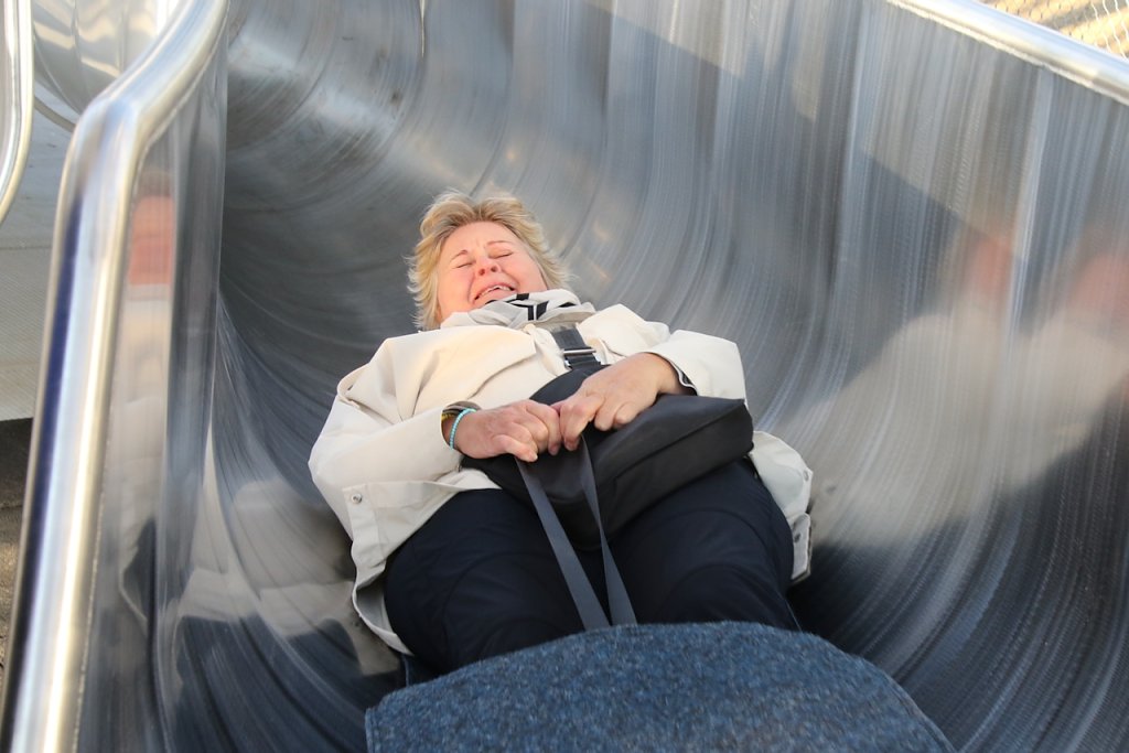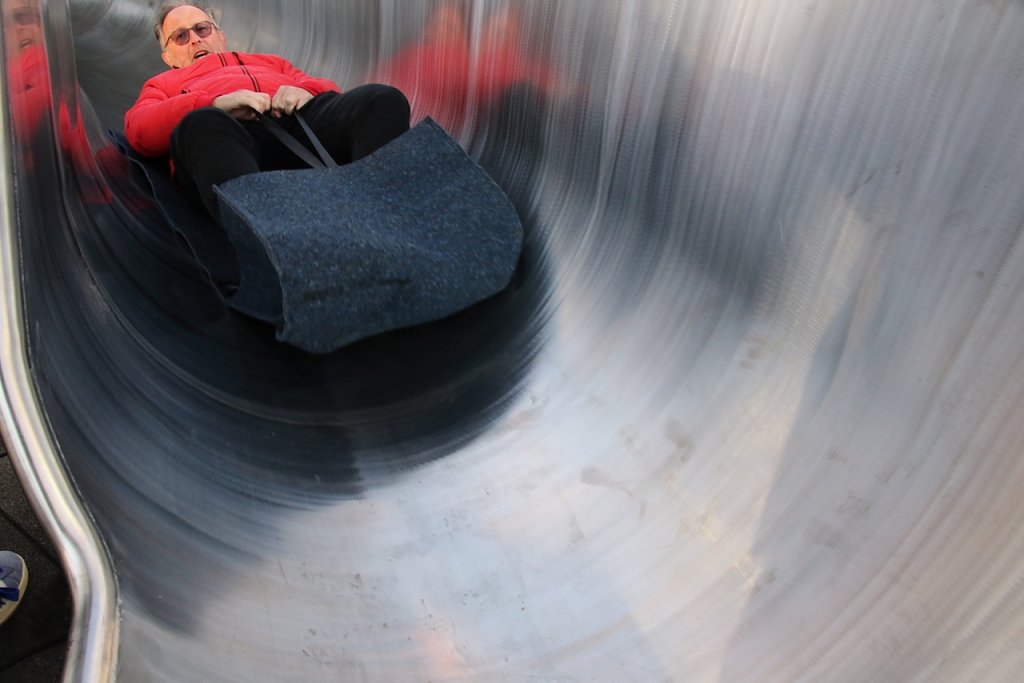Mit der Matte unterm Arm geht es hinauf, viele Treppenstufen hat man zu erklimmen, ehe man auf 44 Metern Höhe einen Rundumblick über den Harz genießen kann. Aber nicht wegen der Landschaft im Herbstsonnenschein kam man heute ins schwitzen, zumindest nicht ausschließlich. Das zweite Highlight des Hexenbesens ist die große Rutsche: mit dem Arschleder unter dem Allerwertesten ging es in wilder Fahrt wieder hinab - daher das Geschrei und Gelächter, das bei rund 300 Gästen zur Eröffnung reichlich vom Turm herab schallte. Es wird mal dunkel, mal hell, mal neon - nach guten 20 Sekunden gleitet man dem Ende der Rutschpartie entgegen und kann sich sogleich wieder hinauf begeben - gerne auch mit dem Fahrstuhl.